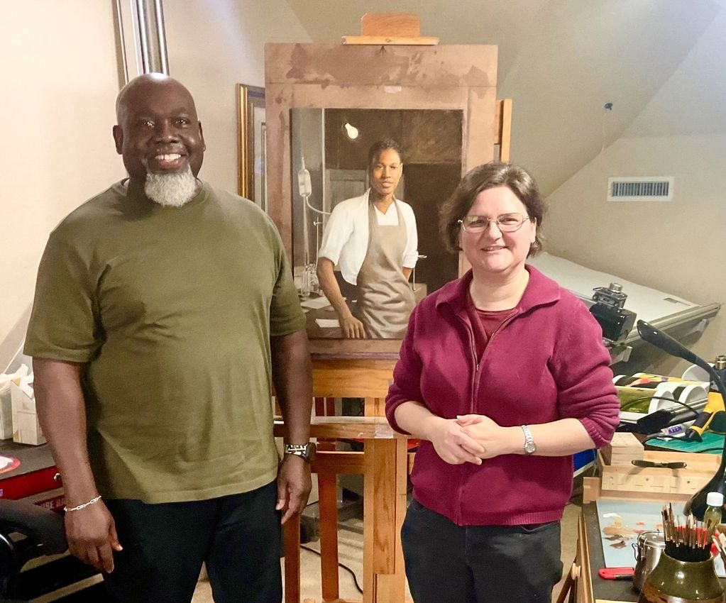 Lisa Crow visiting my art studio to view her commissioned painting. She was very happy with how it turned out.